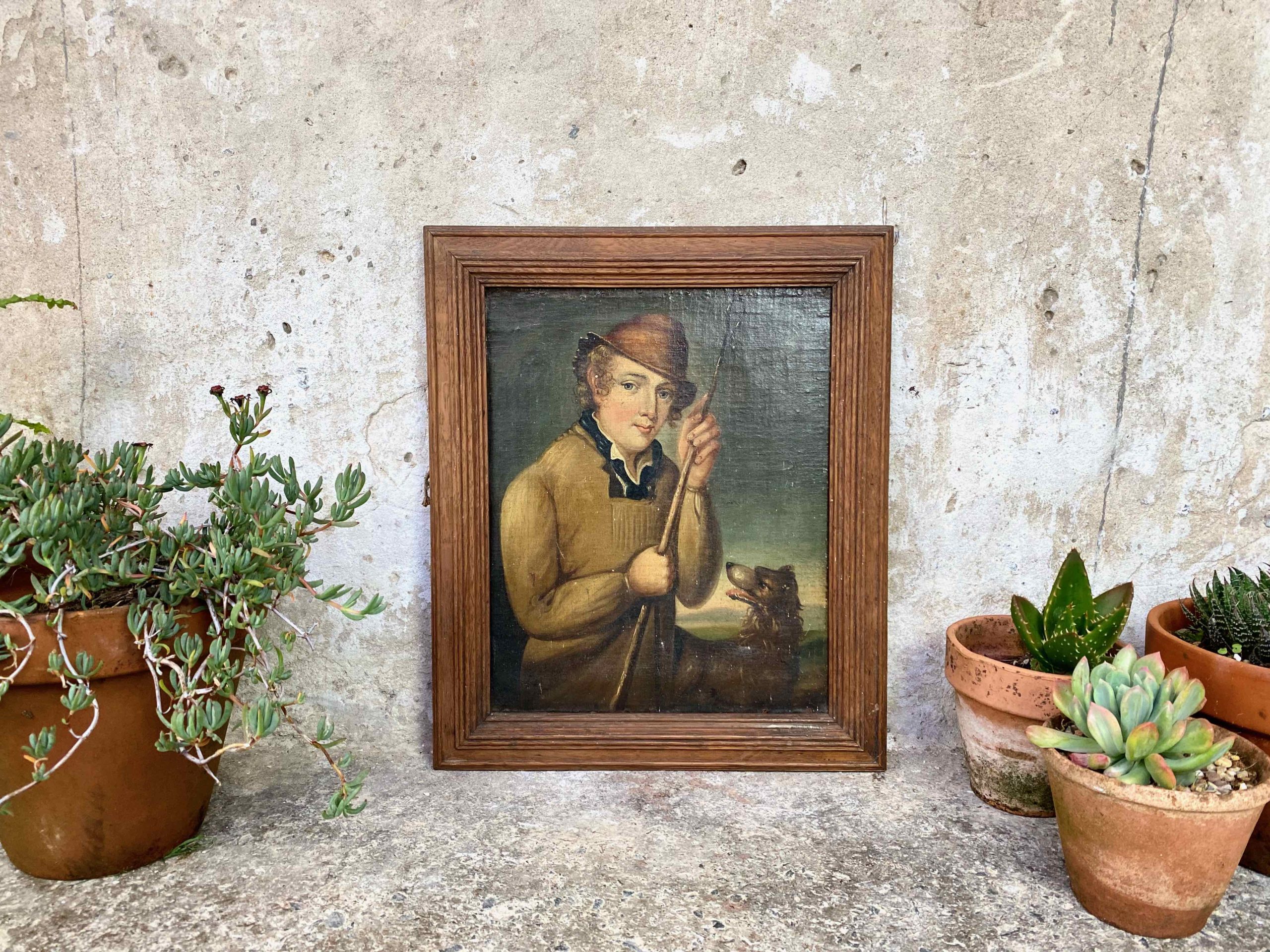This naive oil on canvas depicts a shepherd and his dog. The canvas measures 13.5″ x 11″ and shows some chips to the paint, and marks to the frame. Please see photos. If you would like more photos please get in touch. The frame measures 17″ x 14.25″. A lovely artwork, perfect for display or for a collector.