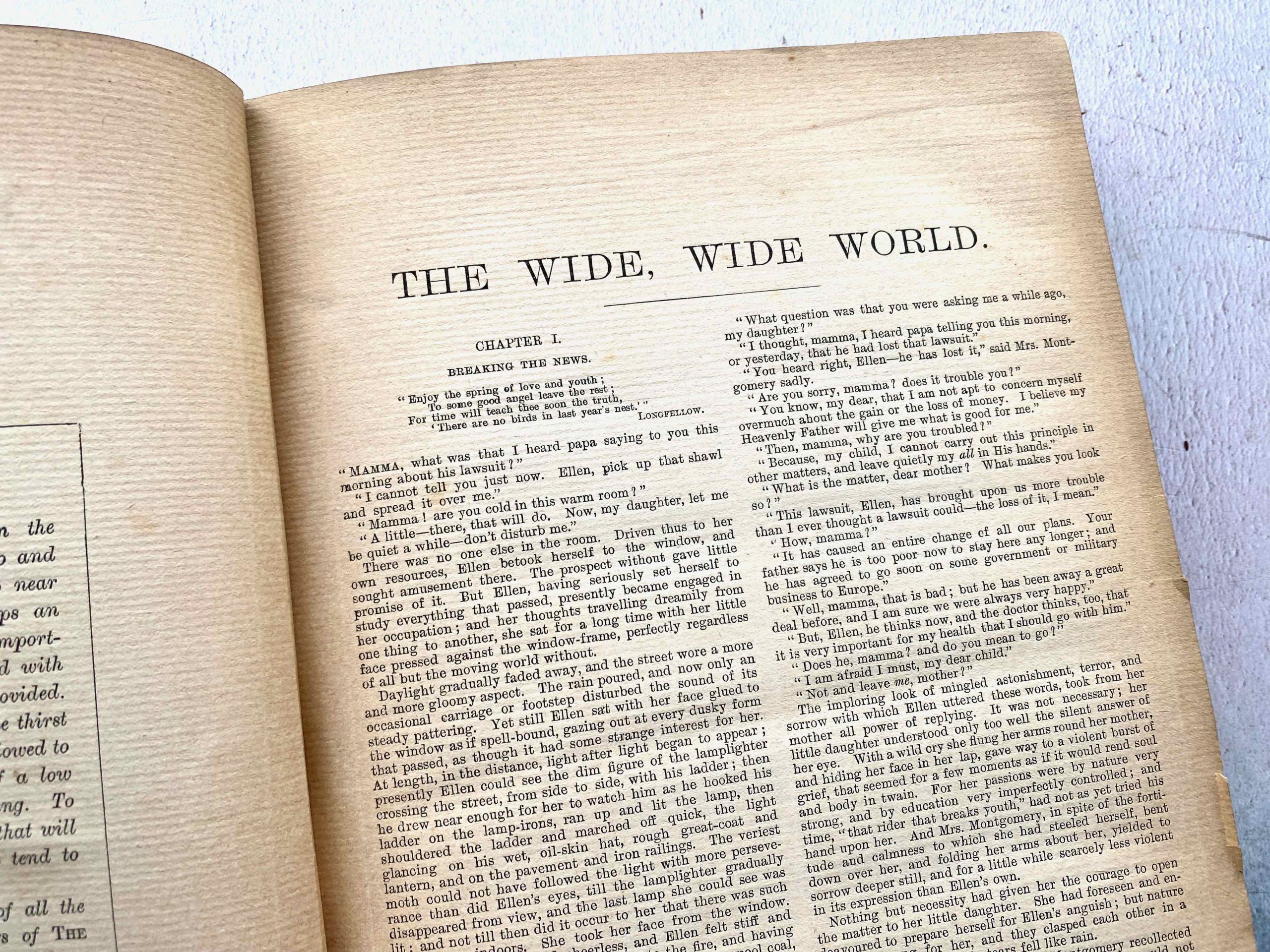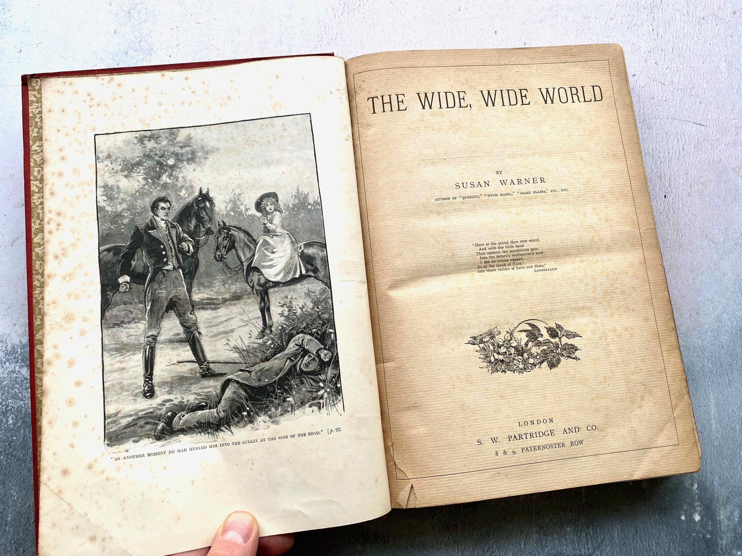 This collection of stories published by SW Partridge & co. London, includes three stories – The Wide Wide World by Susan Warner, Pride and Prejudice by Jane Austen, and From Jest to Earnest by Rev. E.P. Roe.