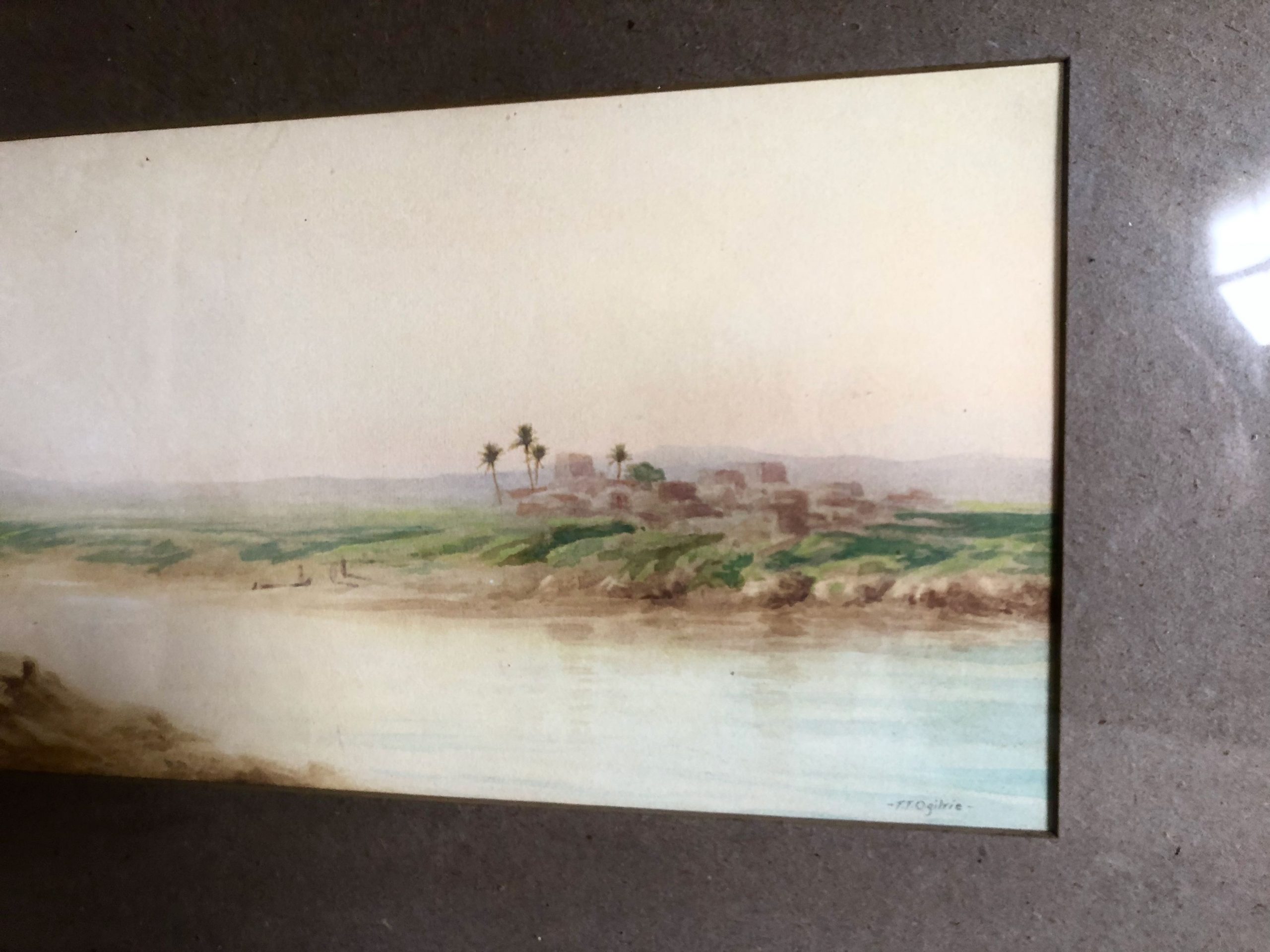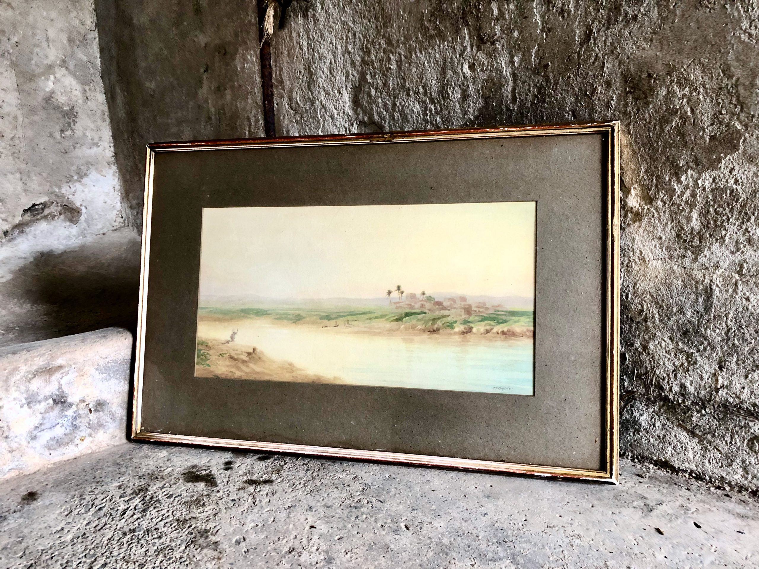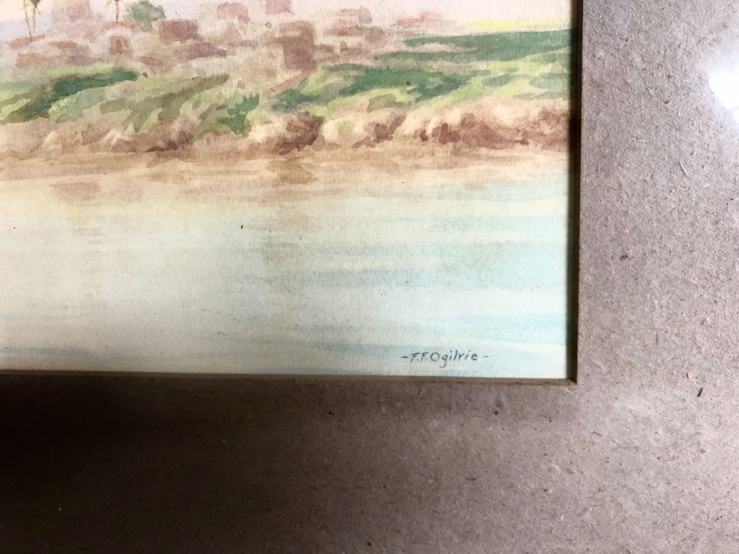 This beautifully painted c1900 watercolour shows wonderful character and is titled “Waiting for the Ferry-boat, A Canal in Upper Egypt Late Afternoon”. The measurements given are for the original antique frame, which shows signs of age and wear with some damage and chips in places (please see photos). The framer was Thomas Andrew & Sons of Manchester. F.F. Ogilvie artwork is highly collectable and has been sold throughout many of Britain’s most prestigious auction houses. I had to take photographs of the painting at an angle to avoid reflections.