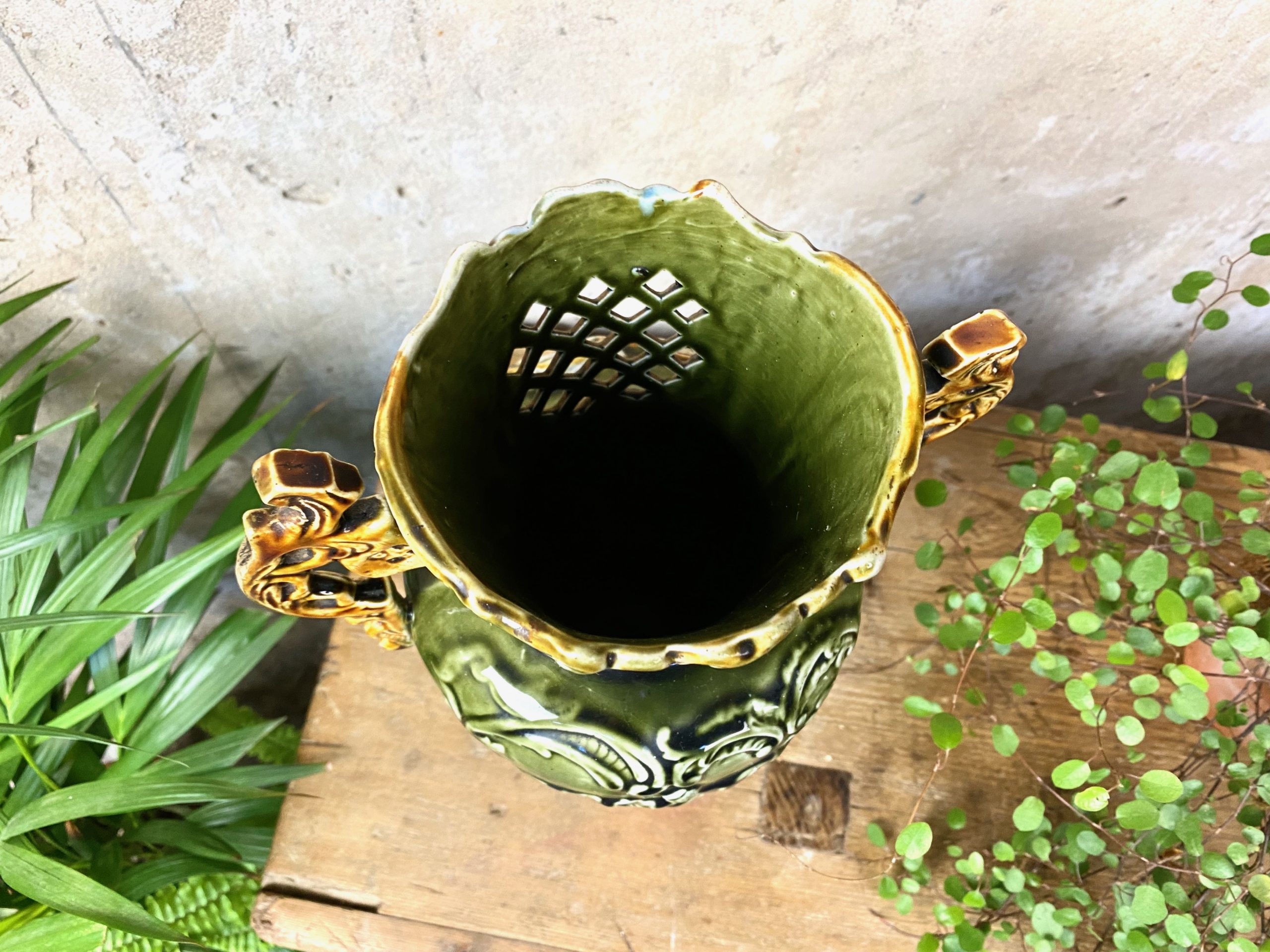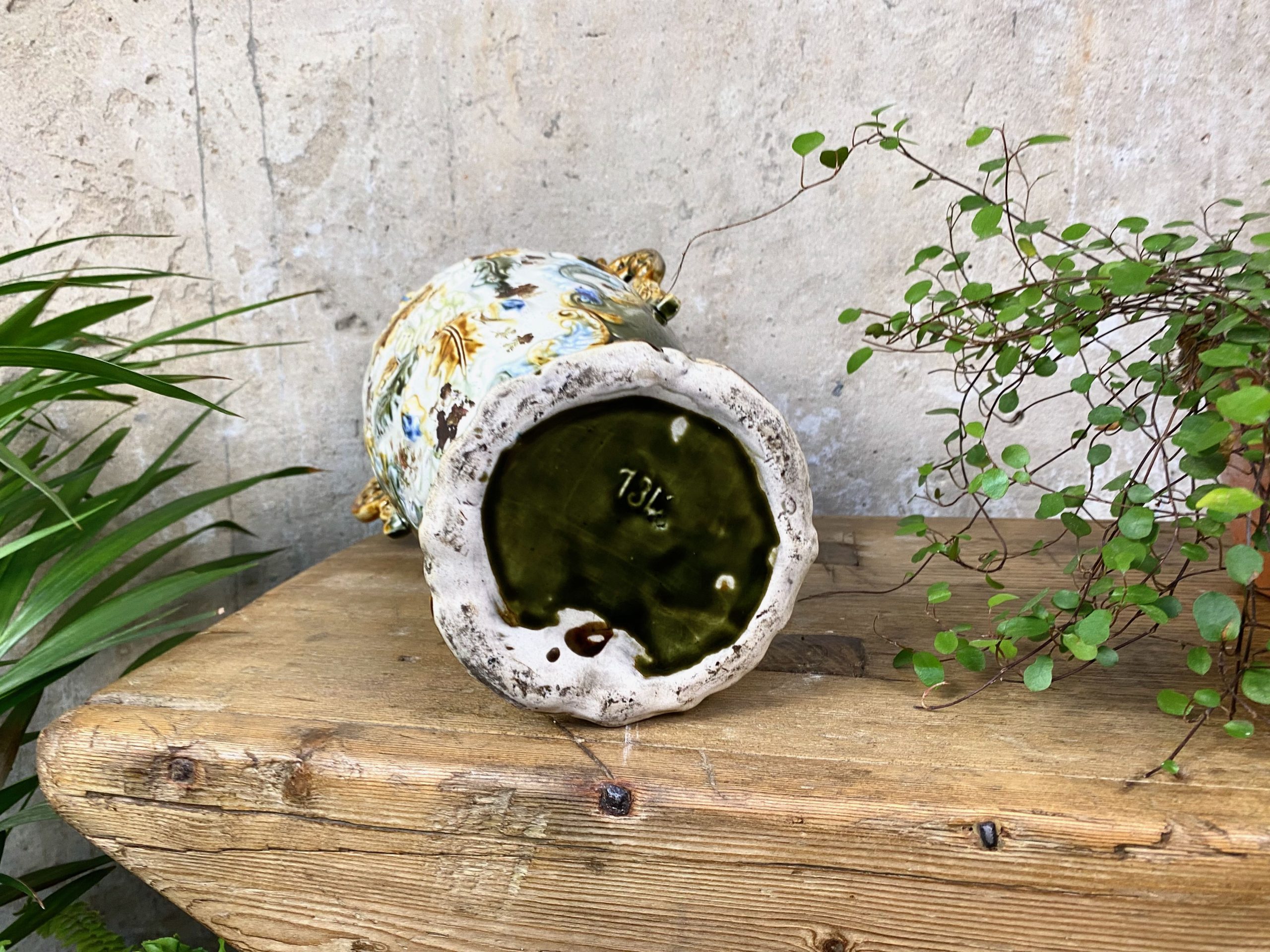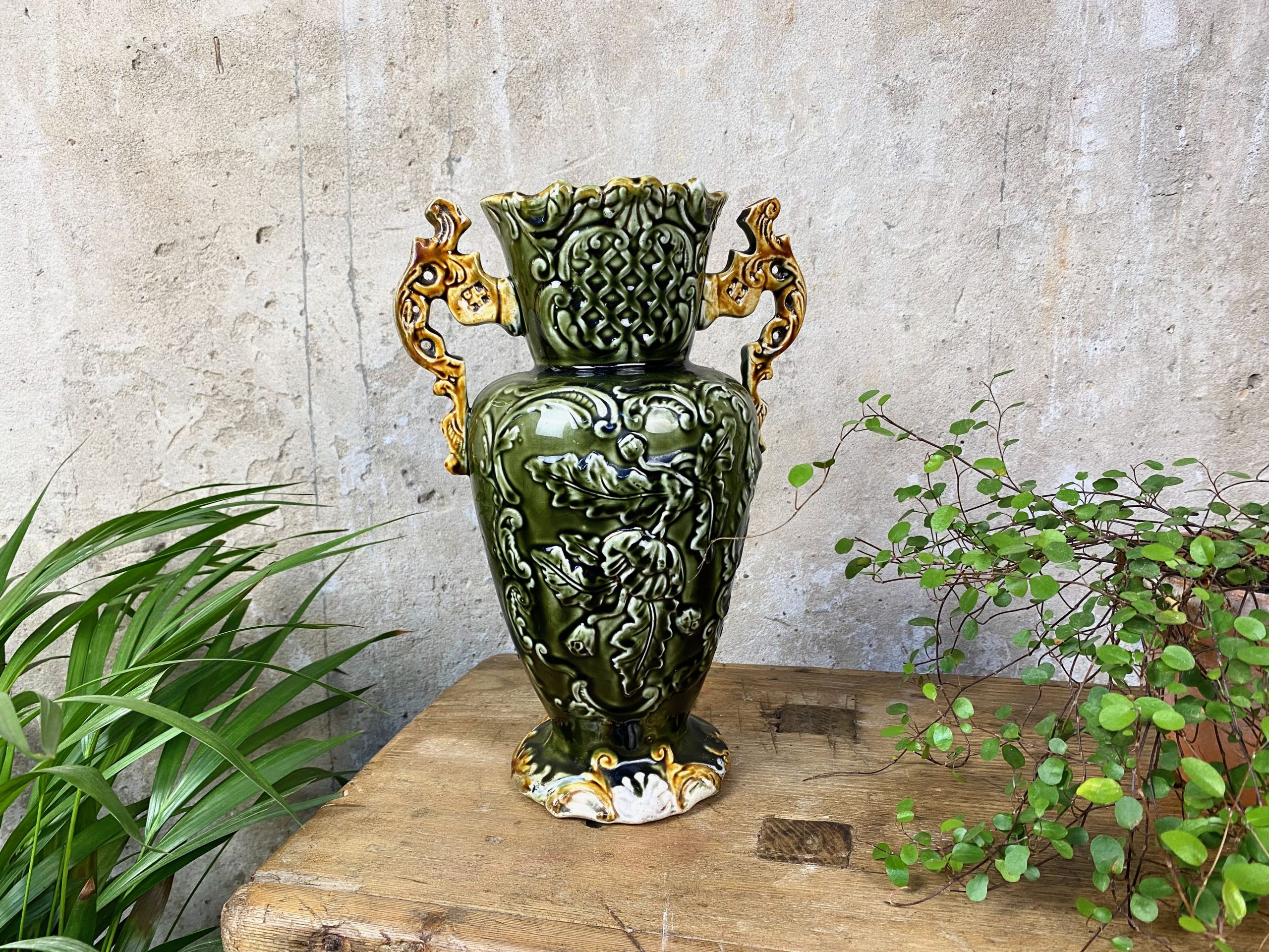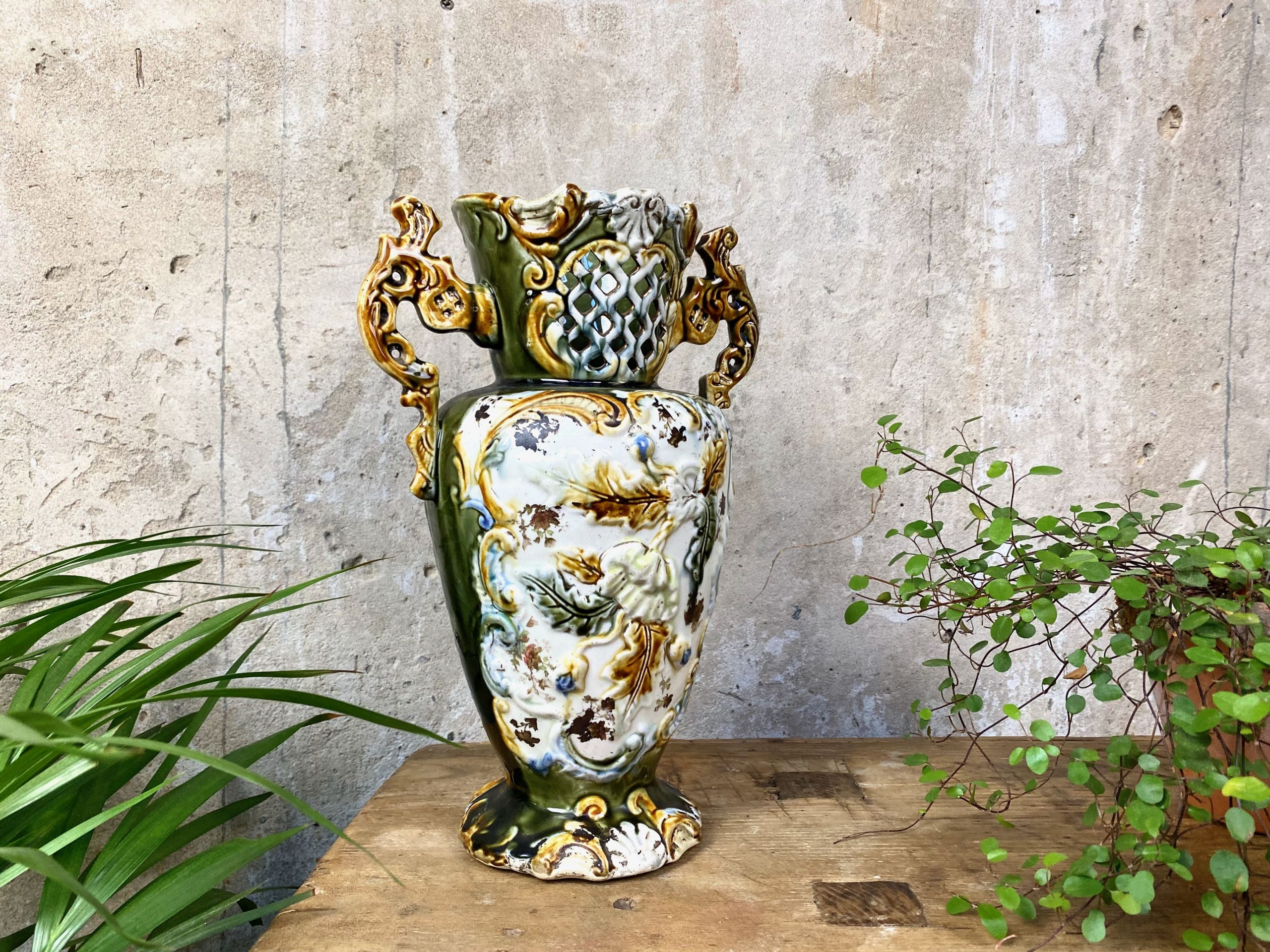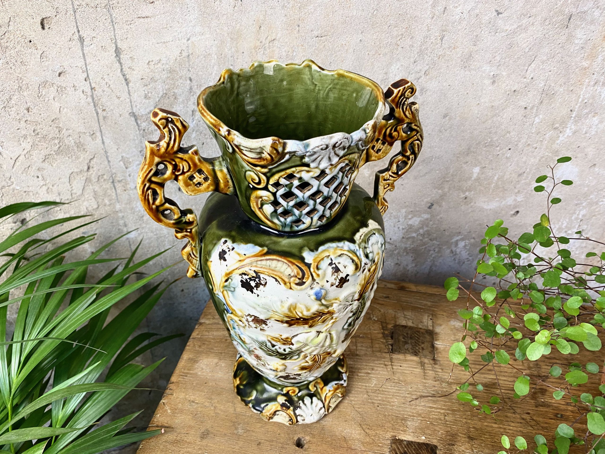 This Victorian Majolica vase measures 12″ tall x 8″ wide and shows age and character with some paint rubbing. It shows no chips or cracks (please see photos).