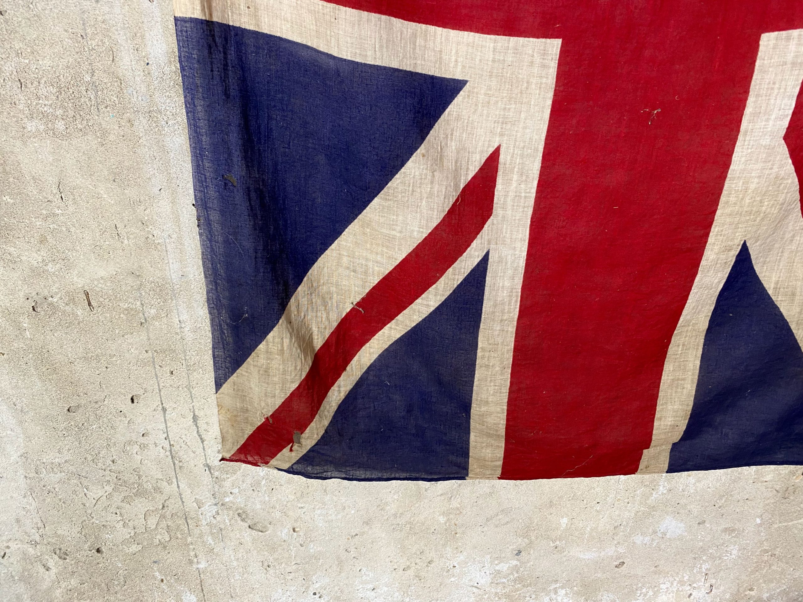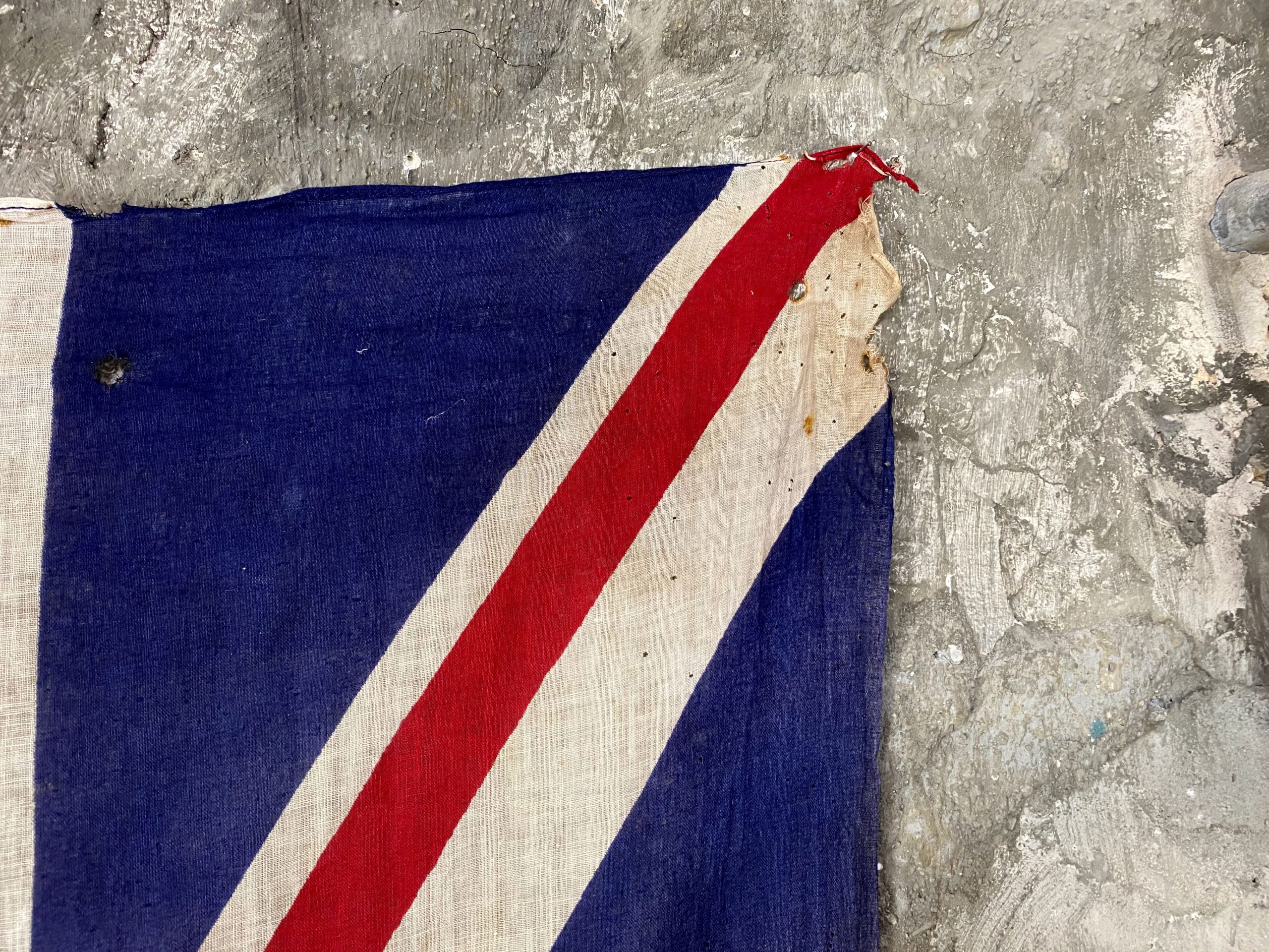 This vintage Union Jack measures 42″ x 31″, and shows age related marks, tears, holes, and colour fading throughout (please see photos).