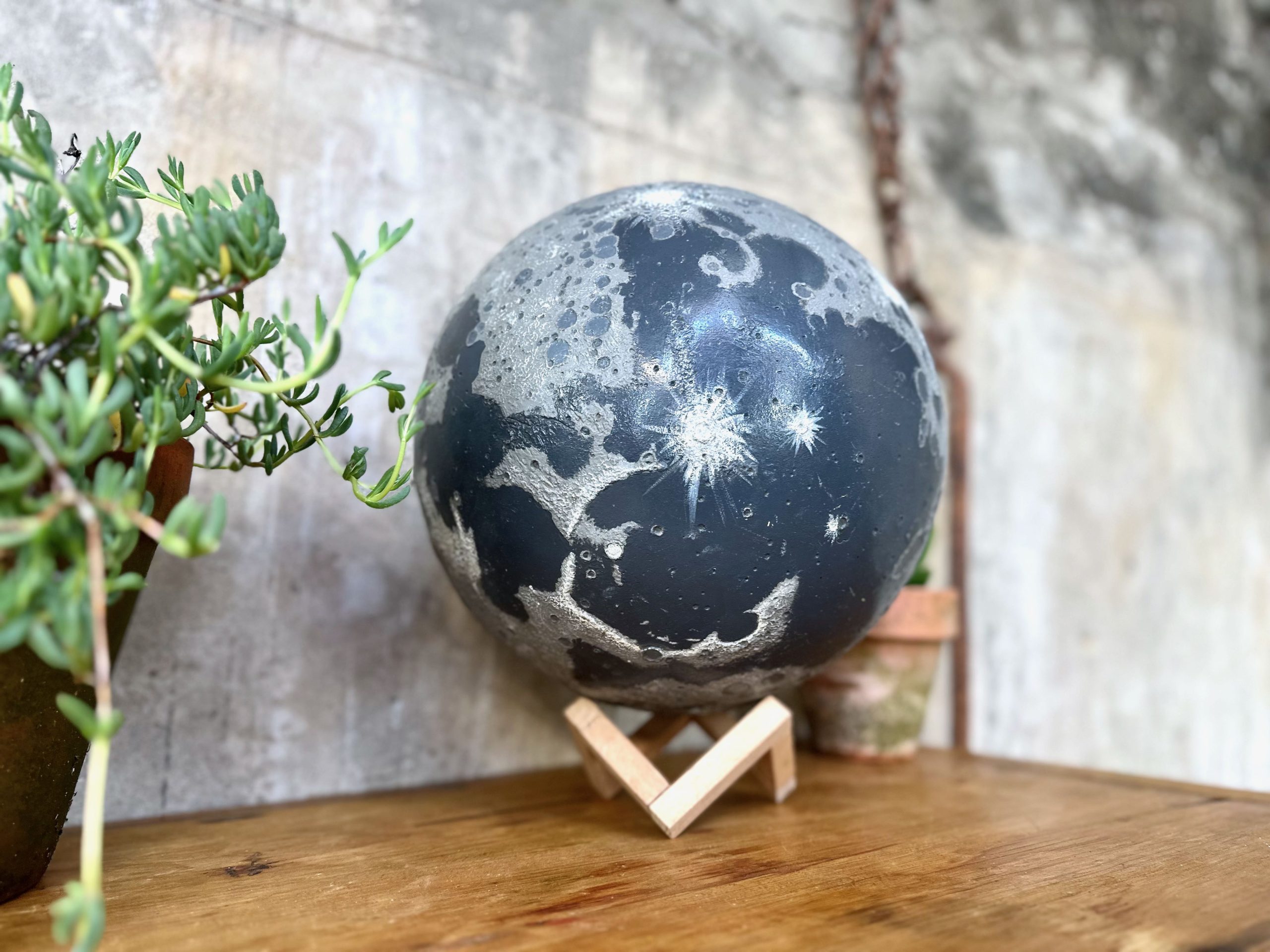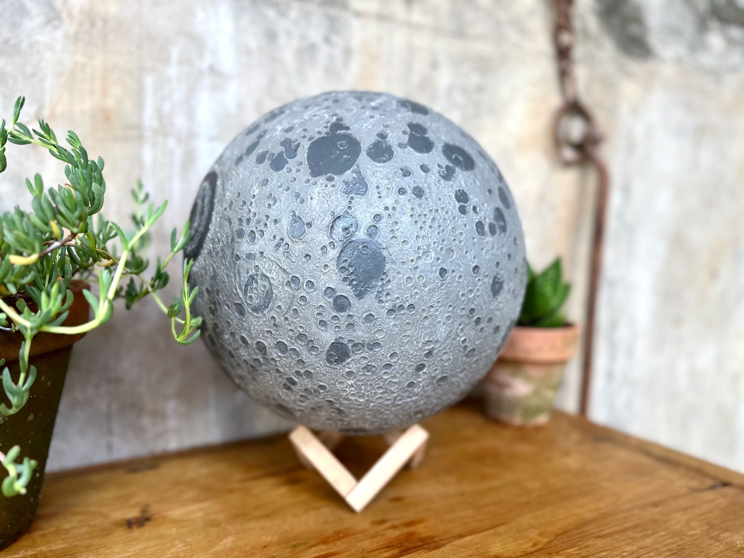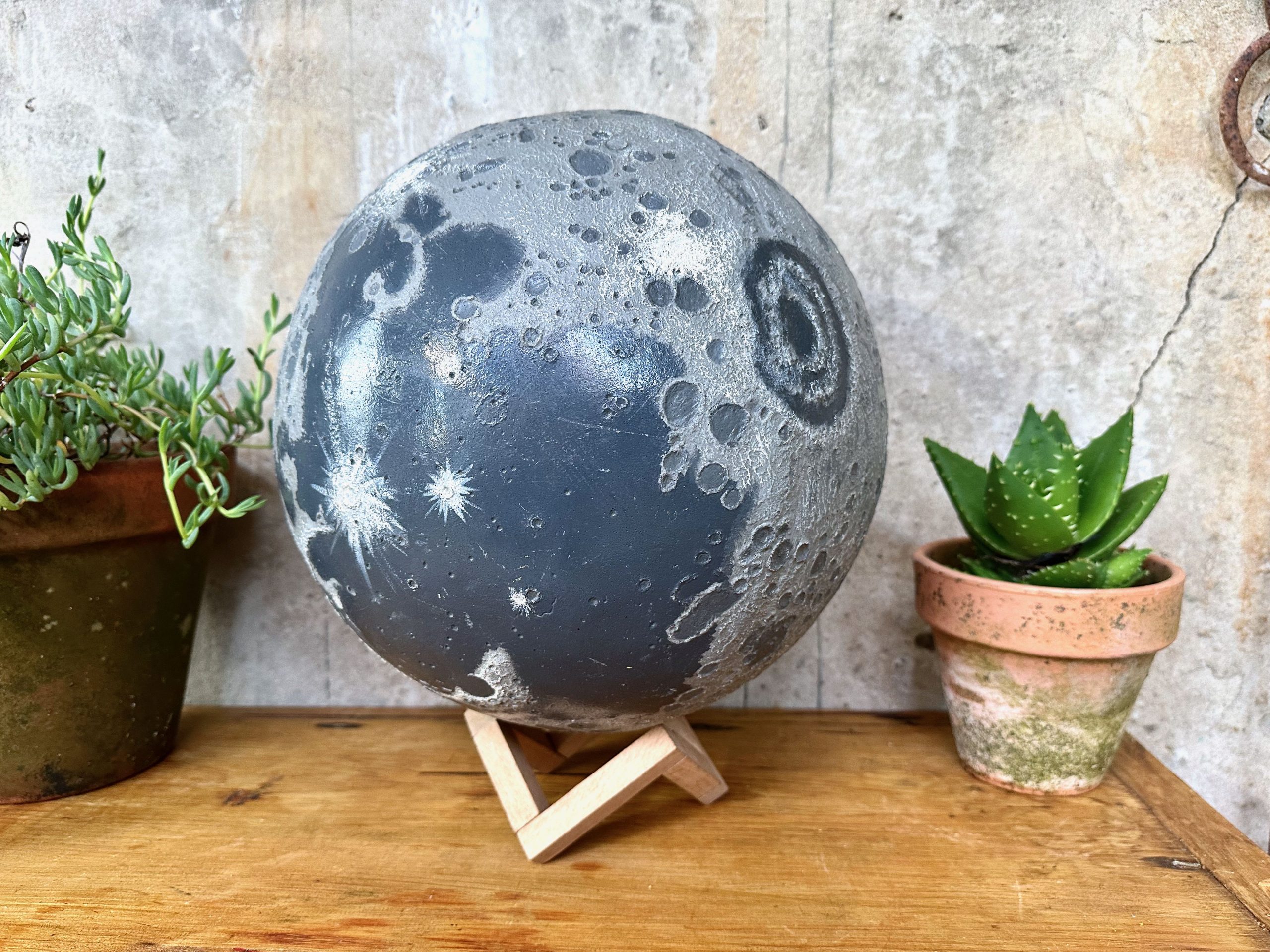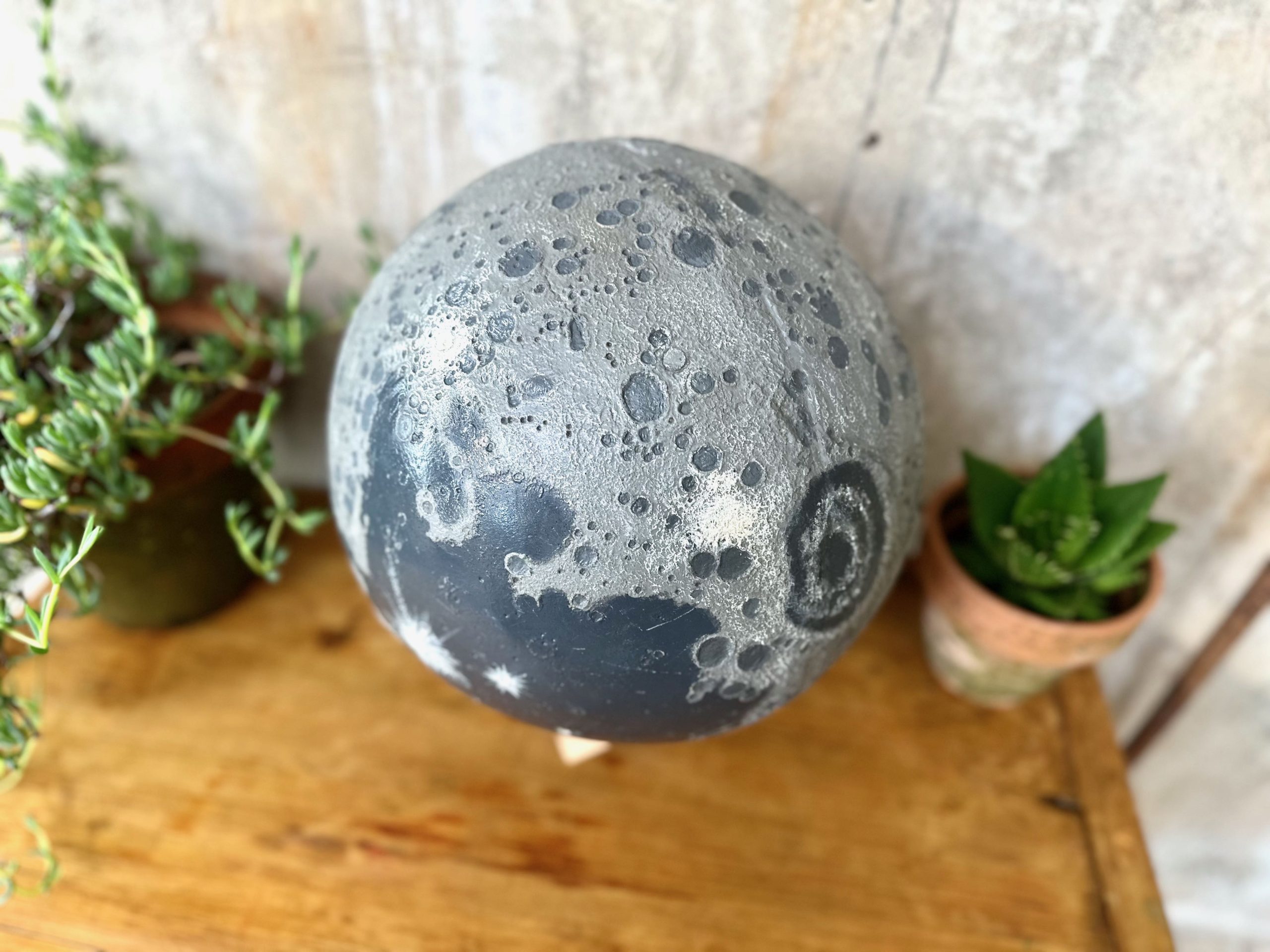 This wonderful vintage c1970 Wightman Lunar Globe measures 12″ wide and has been hand painted. It has three holes in the base, and is placed upon a replacement wooden stand. Please see photos. If you would like more photos please get in touch. Lunasphere Productions was based in Penzance, Cornwall, and produced moon globes to celebrate the Apollo moon landings.