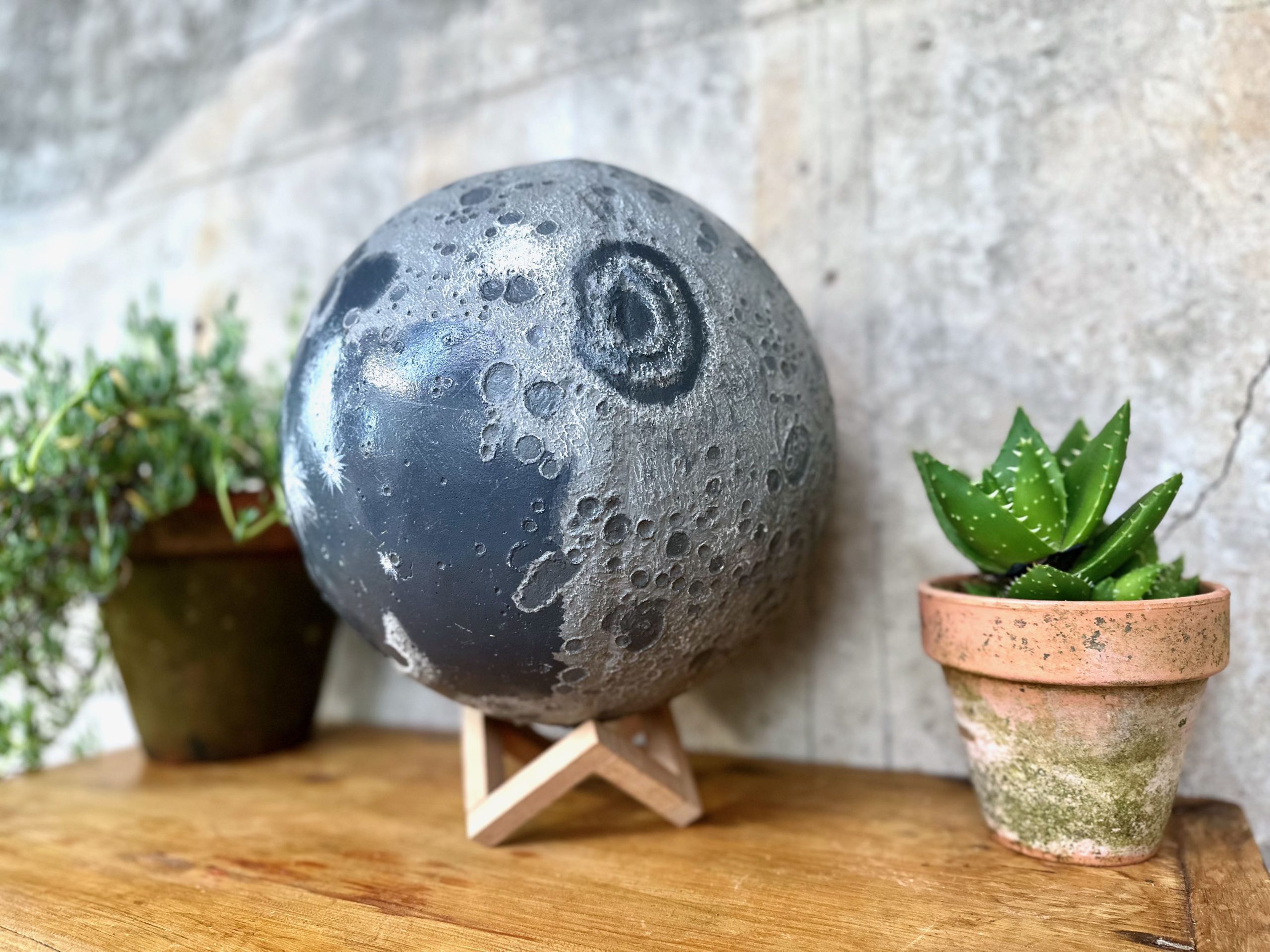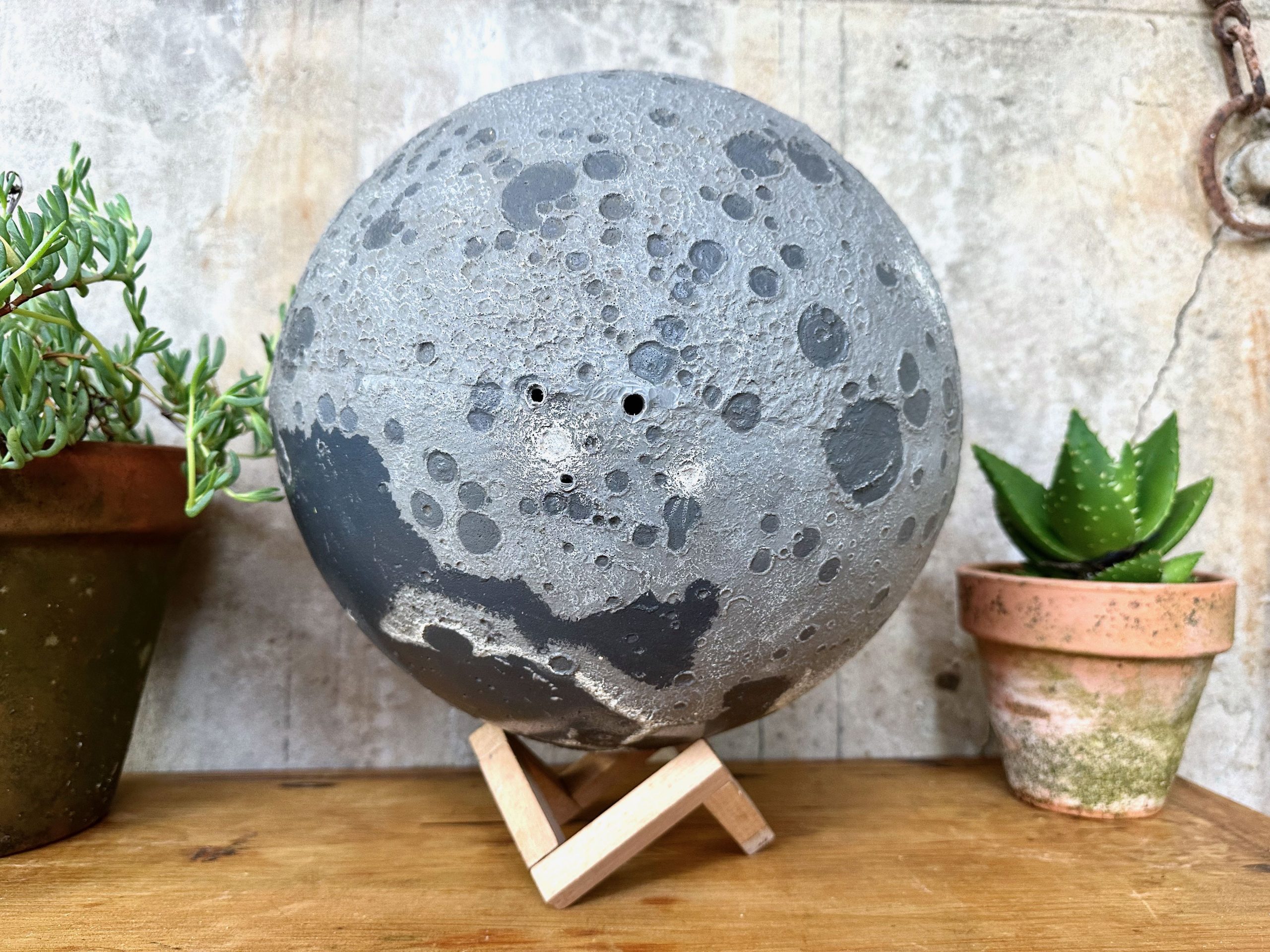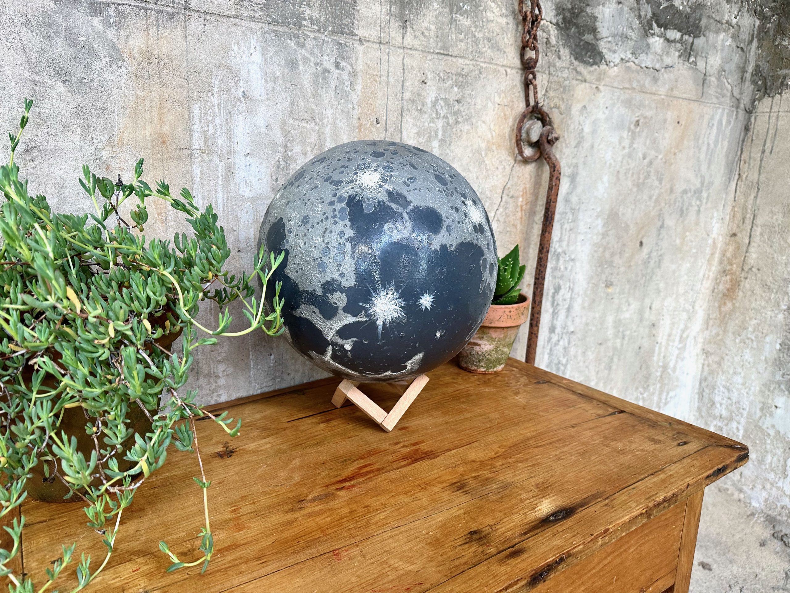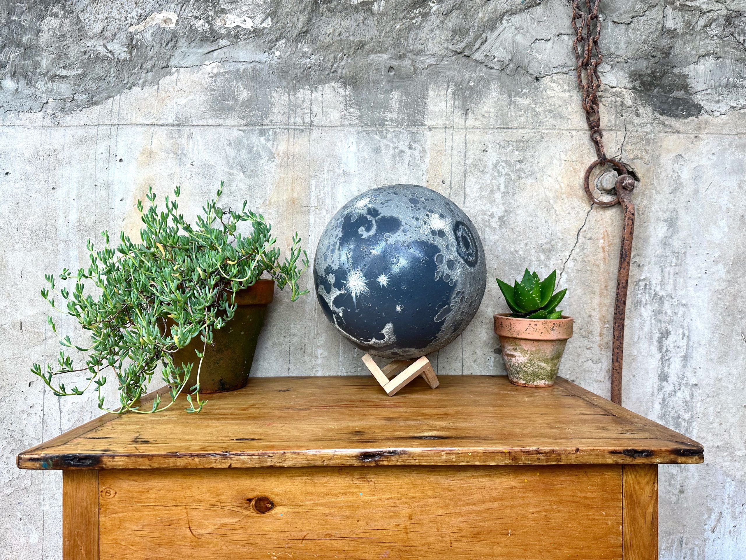 This wonderful vintage c1970 Wightman Lunar Globe measures 12″ wide and has been hand painted. It has three holes in the base, and is placed upon a replacement wooden stand. Please see photos. If you would like more photos please get in touch. Lunasphere Productions was based in Penzance, Cornwall, and produced moon globes to celebrate the Apollo moon landings.